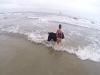 大丈夫、意地悪な波からちゃんと守ってあげるから!ビーチでで少女を波から守るガード犬