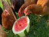 ニワトリも西瓜が好き?午後のひと時、仲良く西瓜を囲むニワトリたち