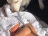 おやおや、お日さま眩しいでしょ!赤ちゃんの目に覆いをかけてあげる犬
