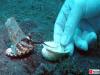 こっちの方が頑丈だよ!プラカップに棲むタコのために貝殻を探してくるダイバー
