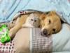 ゴールデン、猫をさっと抱いて添い寝。その姿が何ともあったか~い