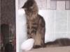メインクーンの子猫、穏やかに牛乳の入ったお皿を拒む。目の前に置かれてそっと落とす。