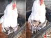 鶏のお母さん「うちの子たちに構わないで!」と、3匹の子猫の面倒を見る