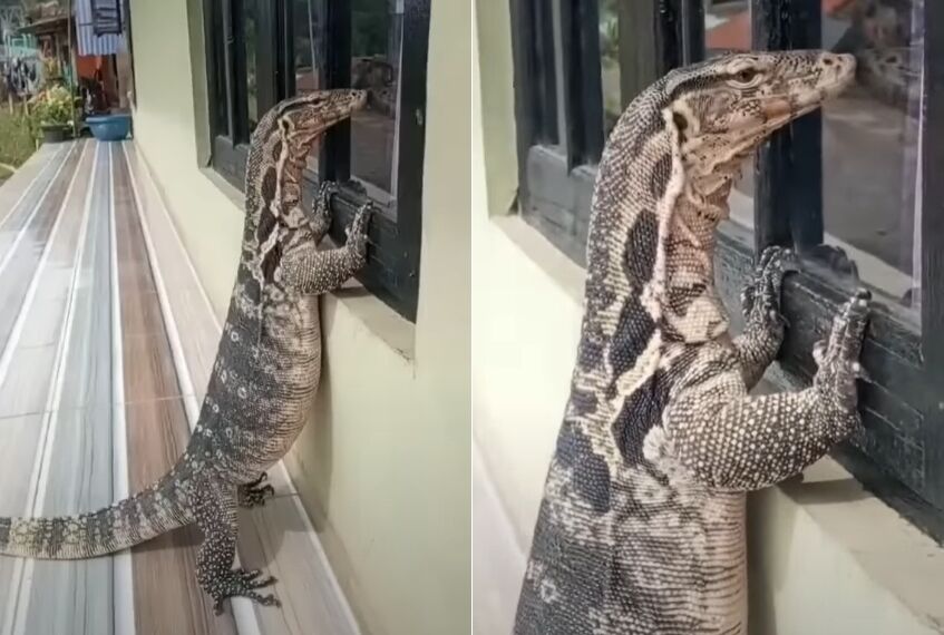 窓の外から、家の中を覗き込んでいるトカゲ。