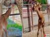 Curious giraffe inspects baby deer at Louisiana Wildlife Park