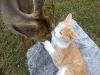 「遊びに来たよ、元気だった?」「会いたかったよ、久しぶり」子ジカと猫の仲良しこよし