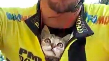 サイクリストに拾われた子猫、胸元にちょこんと入って感謝のキス