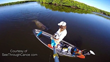 ニンゲンさん、何してるの?なんか不思議な乗り物だね。シースルーカヌーになつくマナティ