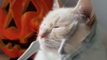 ハロウィンやし、こんなんどう?骸骨にモフられて恍惚の猫