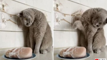 猫、かちんこちんの鶏肉を前に「これ、どうしたらいいニャ?」と怪訝そうな顔を見せる
